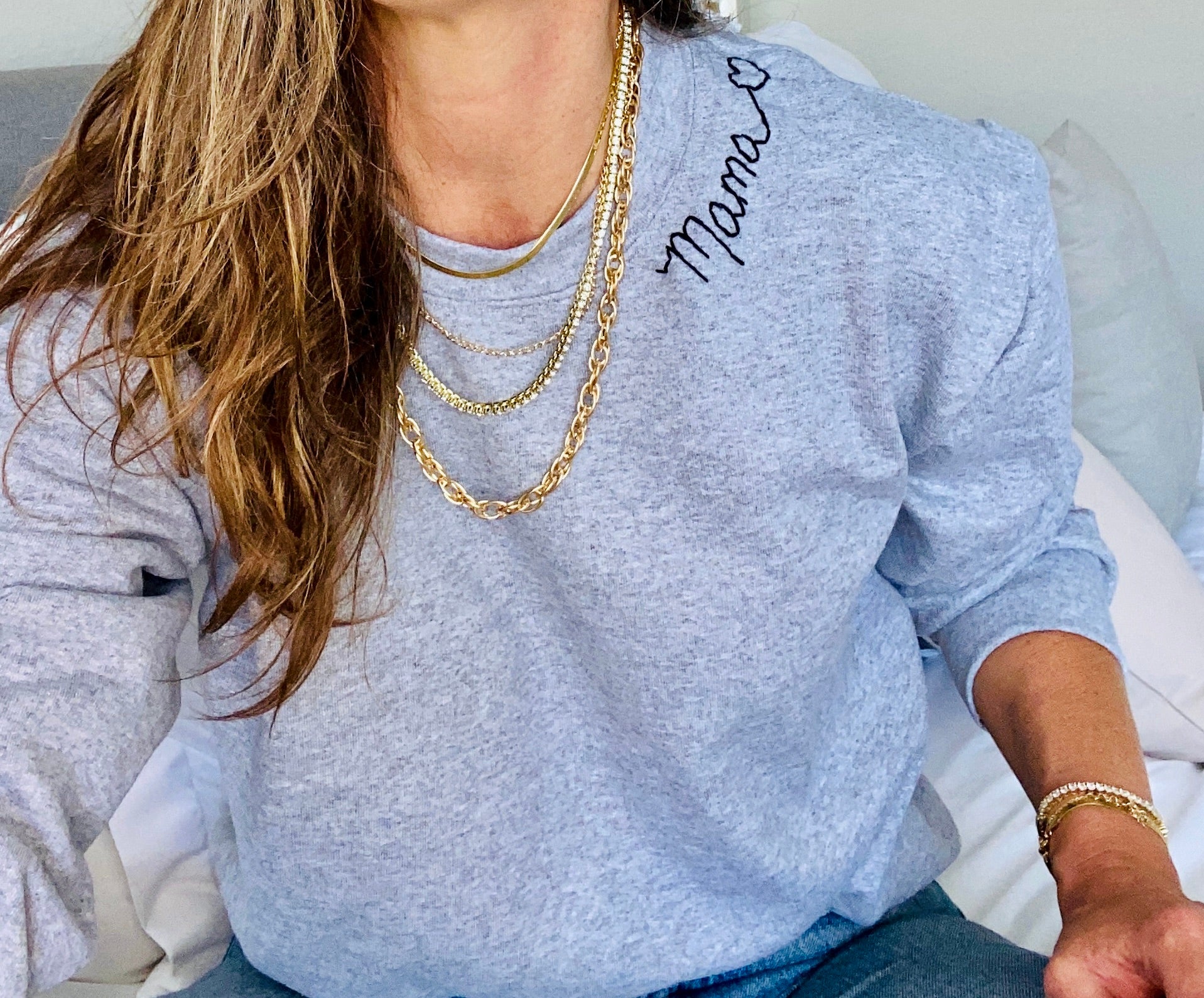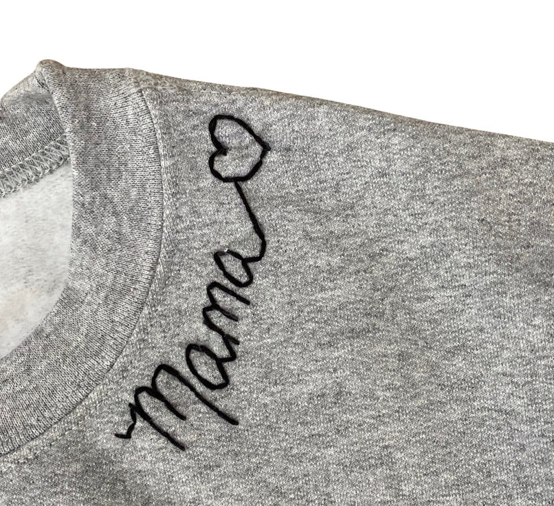 The classic vintage grey sweatshirt with black stitch that says "Mama" with a heart is the perfect gift for yourself or that special mom.