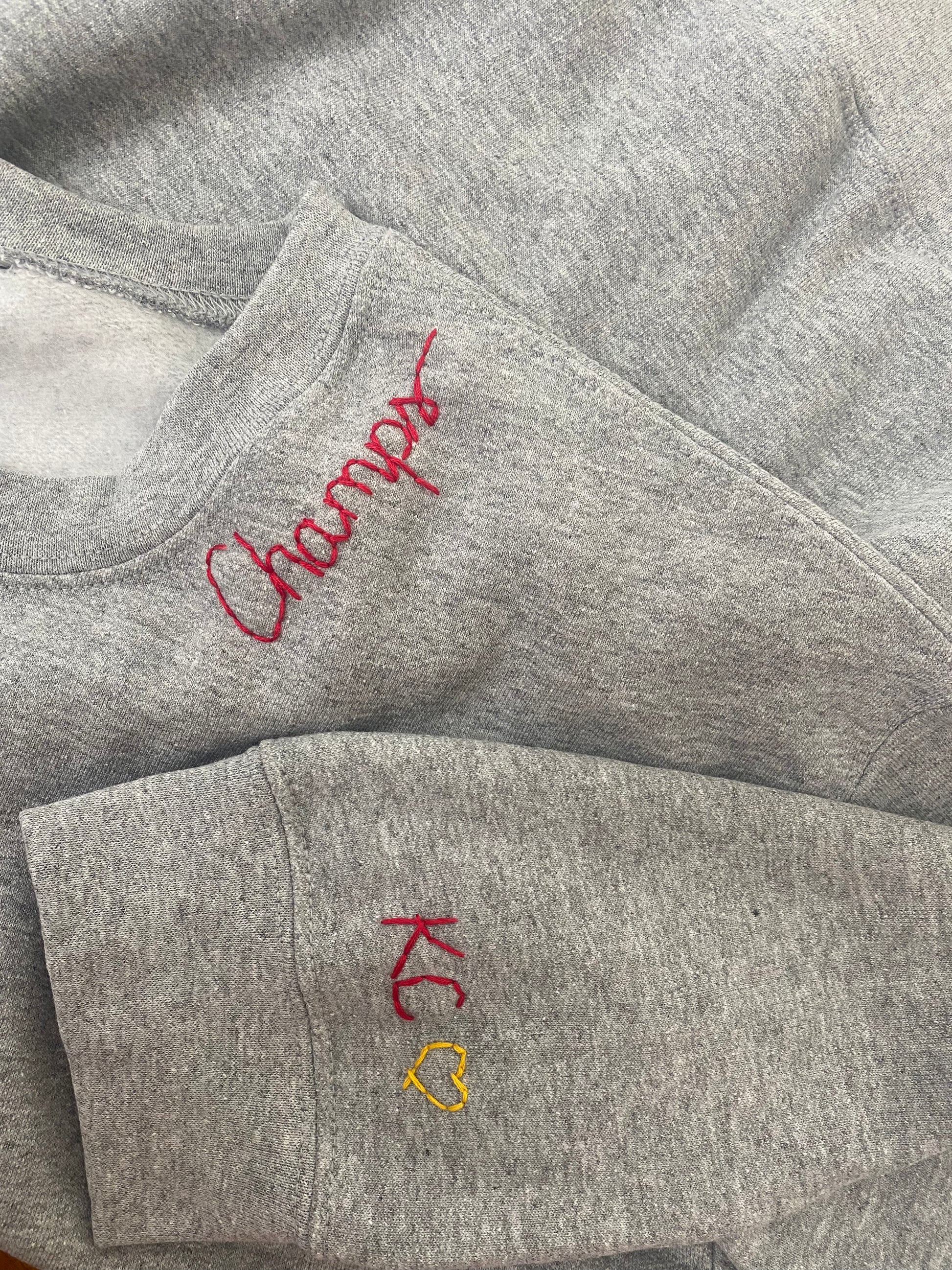 The Vintage Grey has red Champs on the collar with KC and a heart on the sleeve