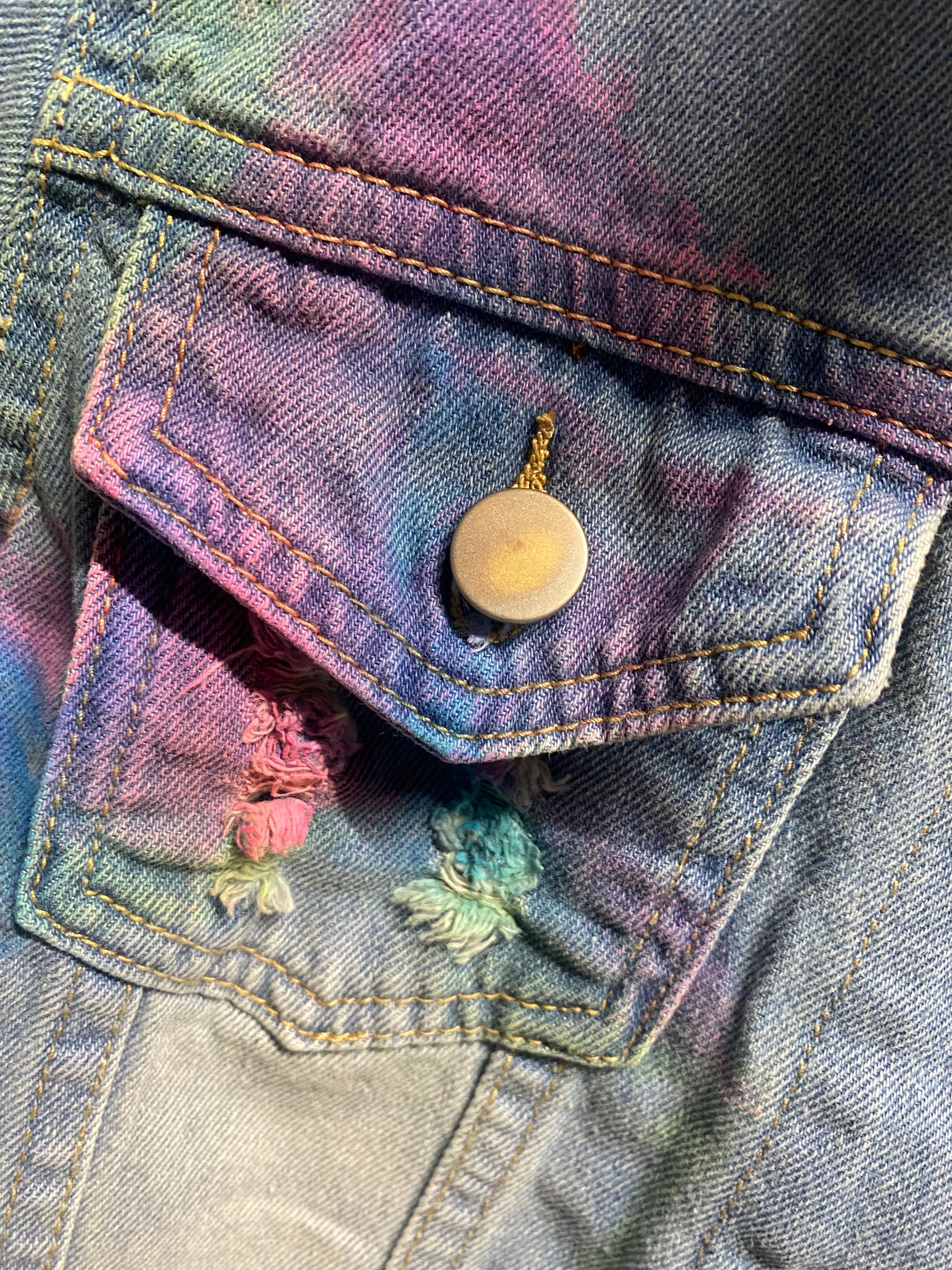get your hands on this distressed youth denim jacket with neon tie dye detail!